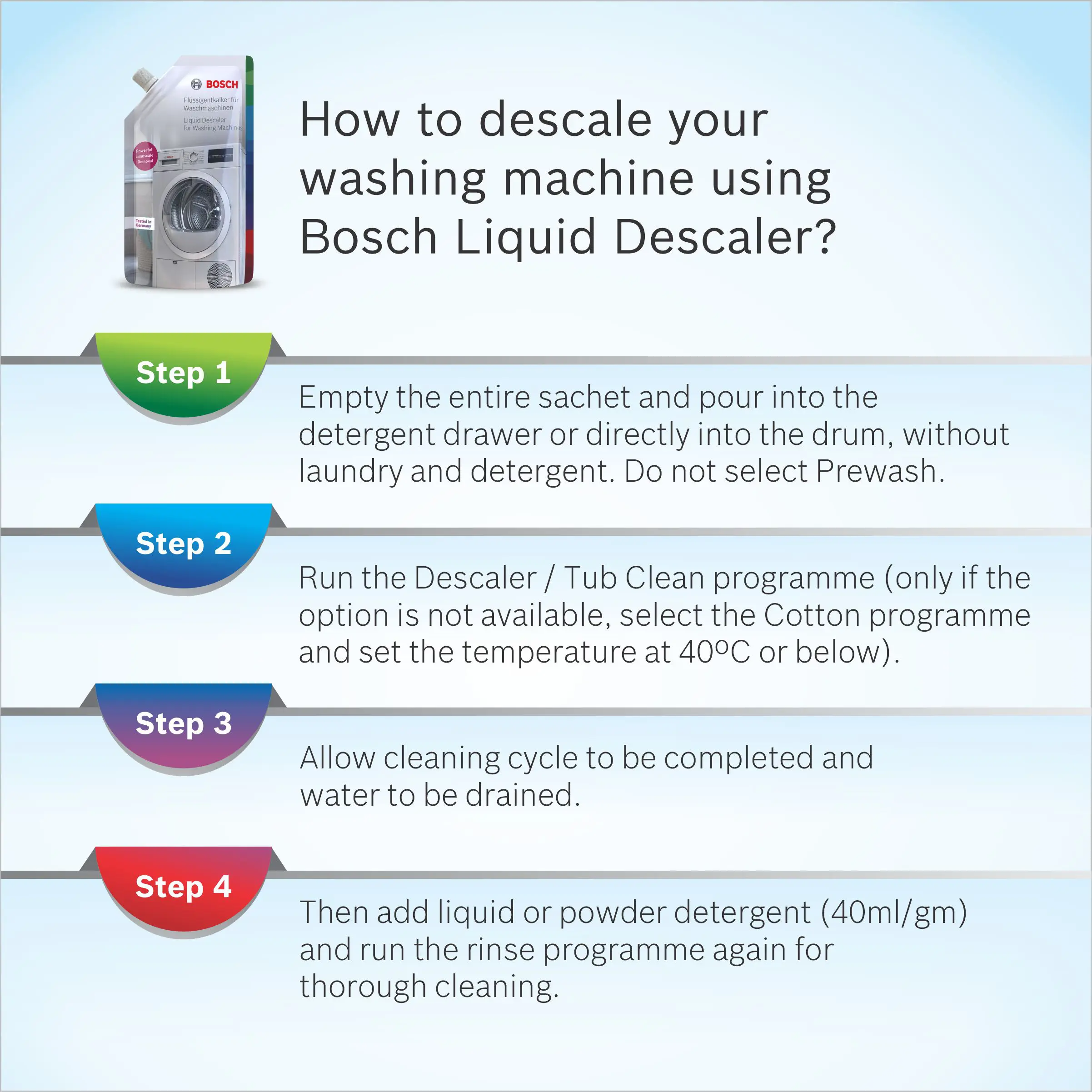 Liquid Descaler enhances the washing quality and increases the lifespan and performance of your appliance.