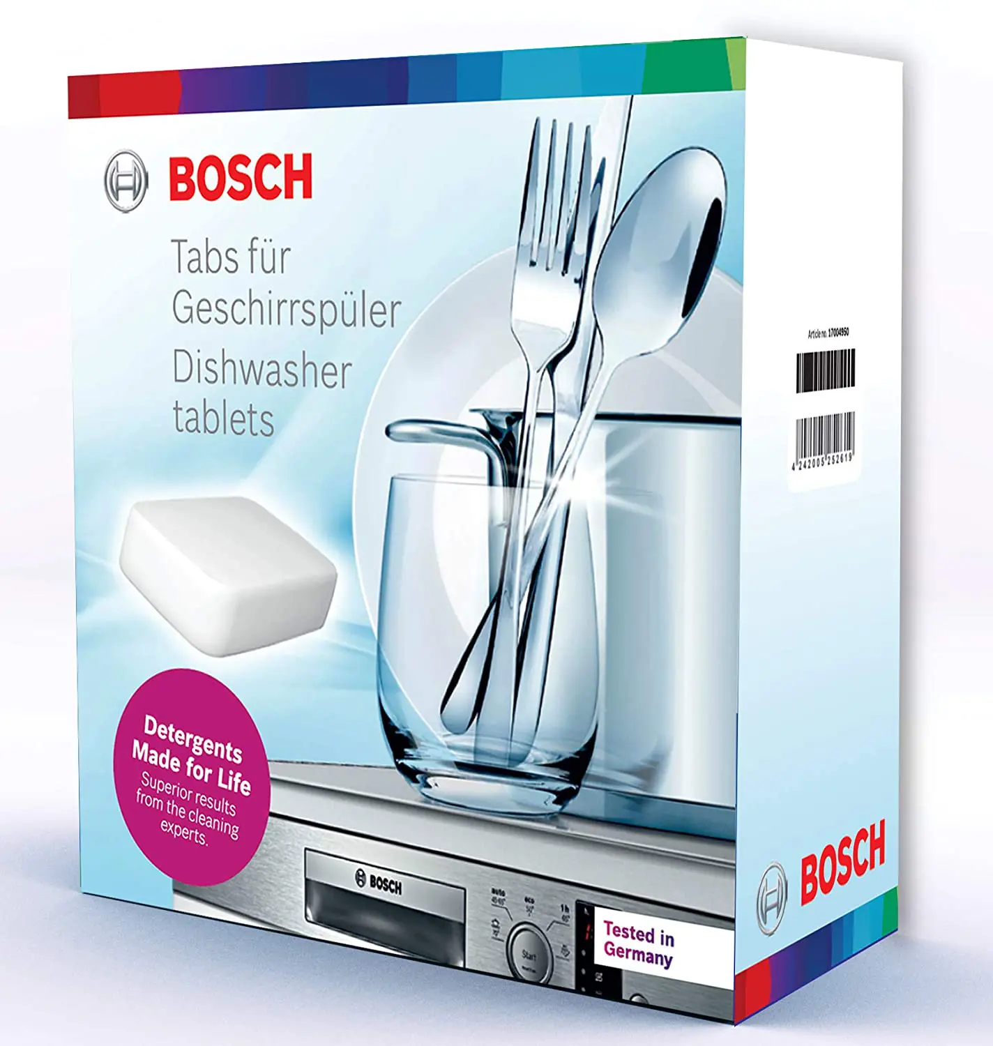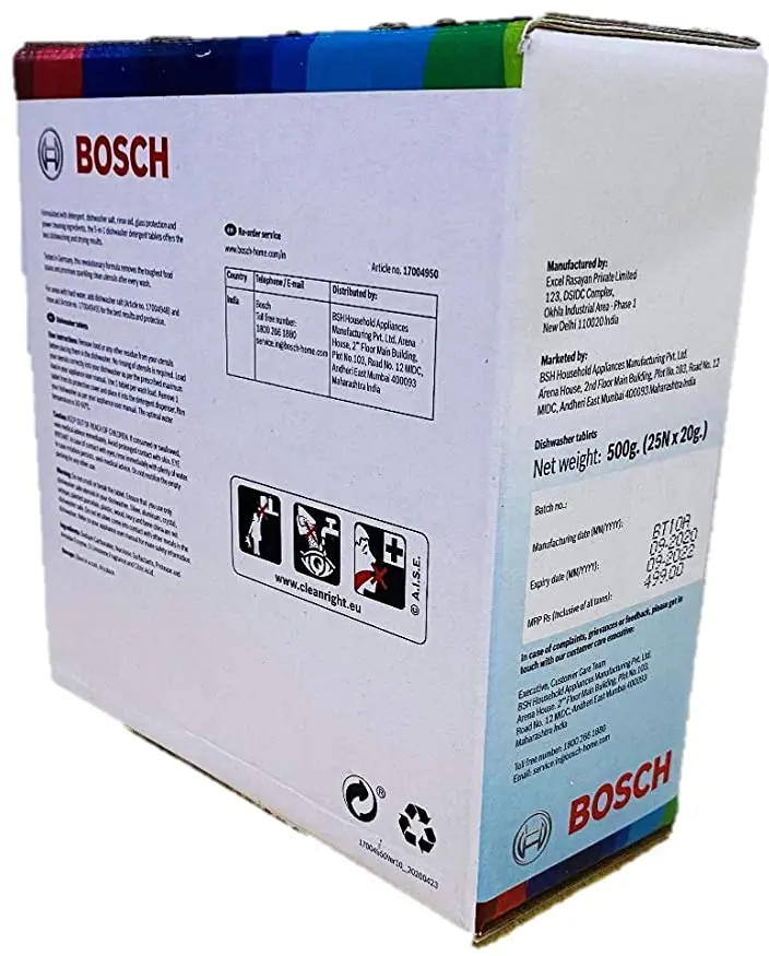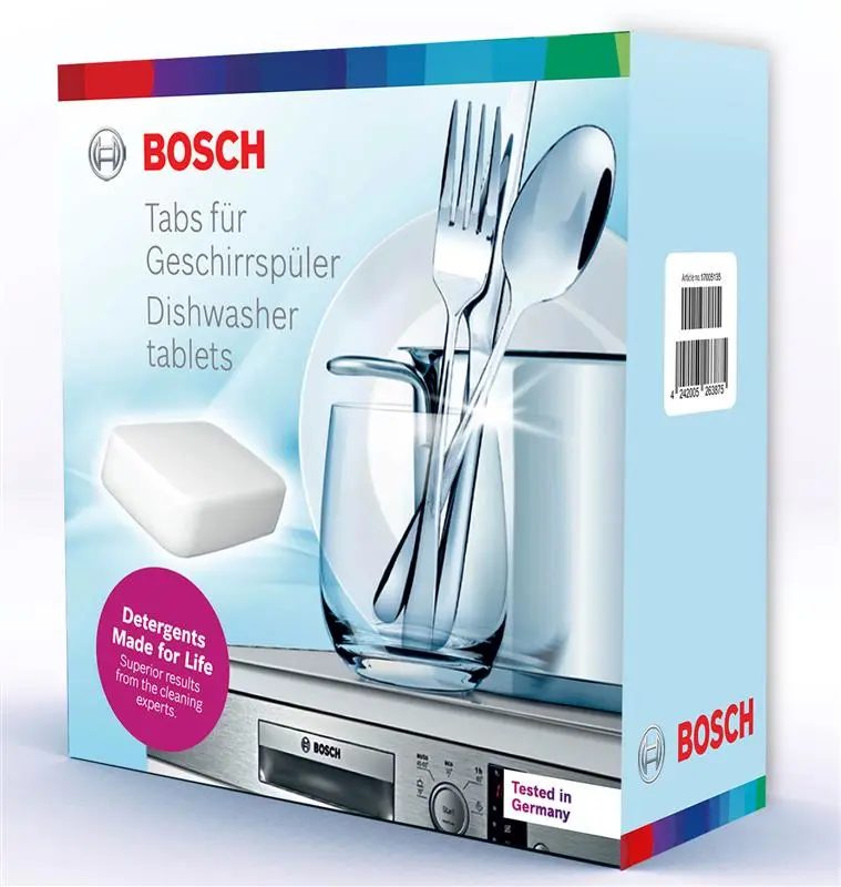 Bosch original dishwasher tablet is a 5-in-1 tab bursts with the amazing power of detergent, salt, rinse-aid, glass protection and power clean action.