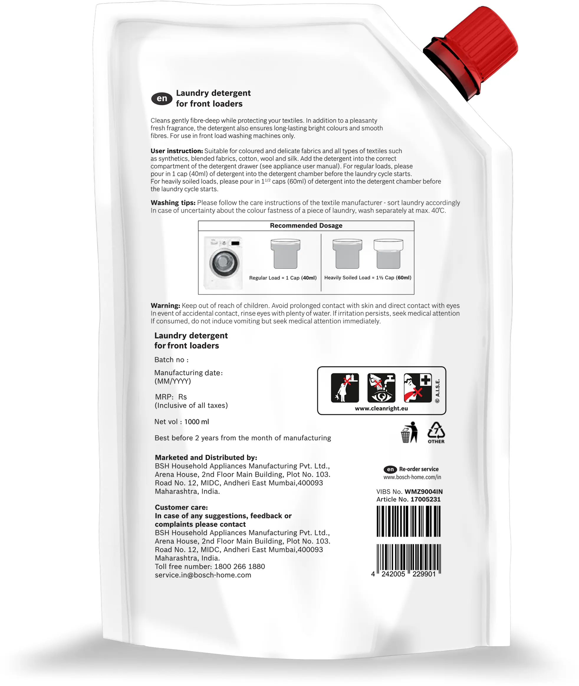 Bosch Liquid Detergent for Front Load Washing Machine -1 L Refill Pack17005231
