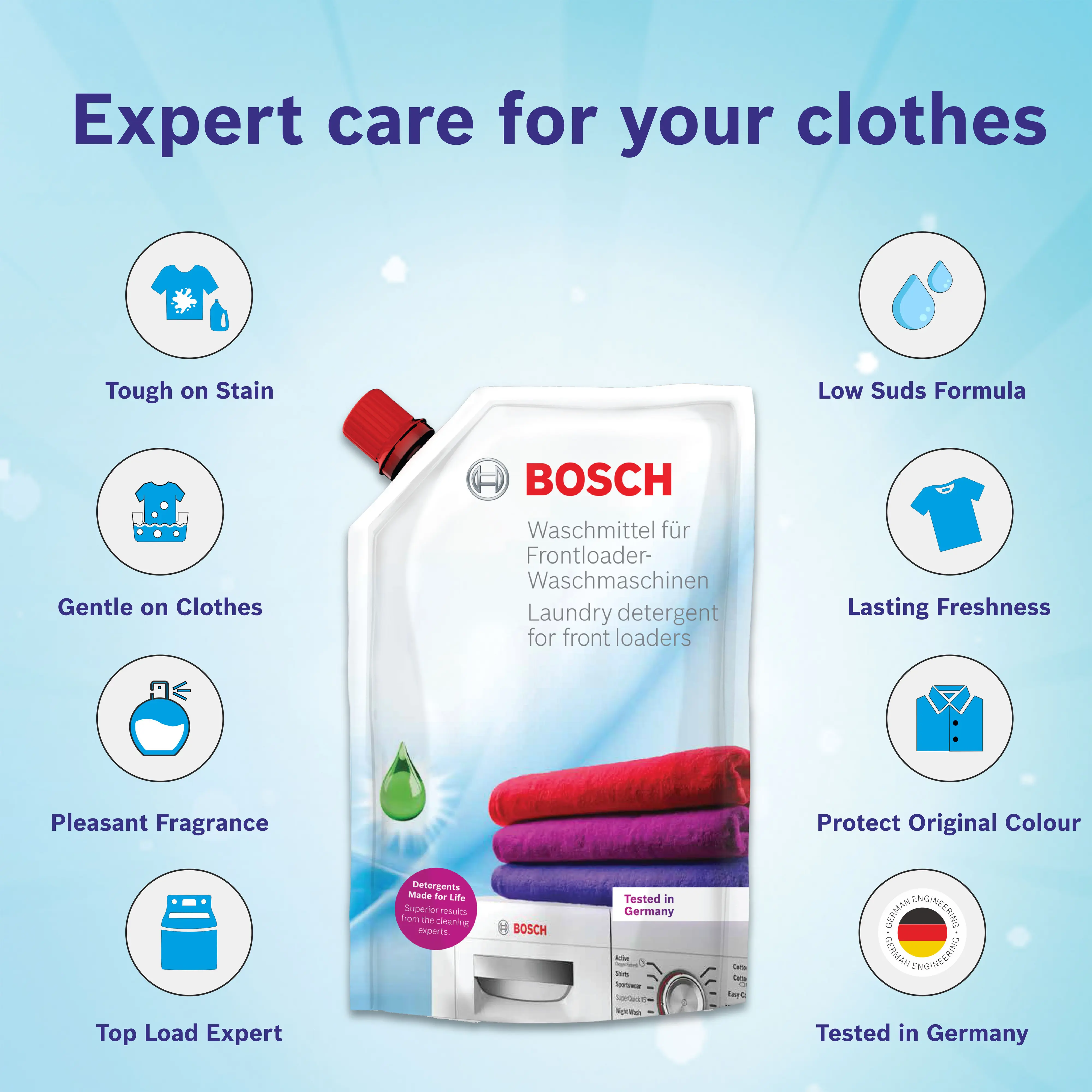 Bosch original front load liquid detergent is formulated to remove tough stains in washing machine by penetrating deep into the fabric.